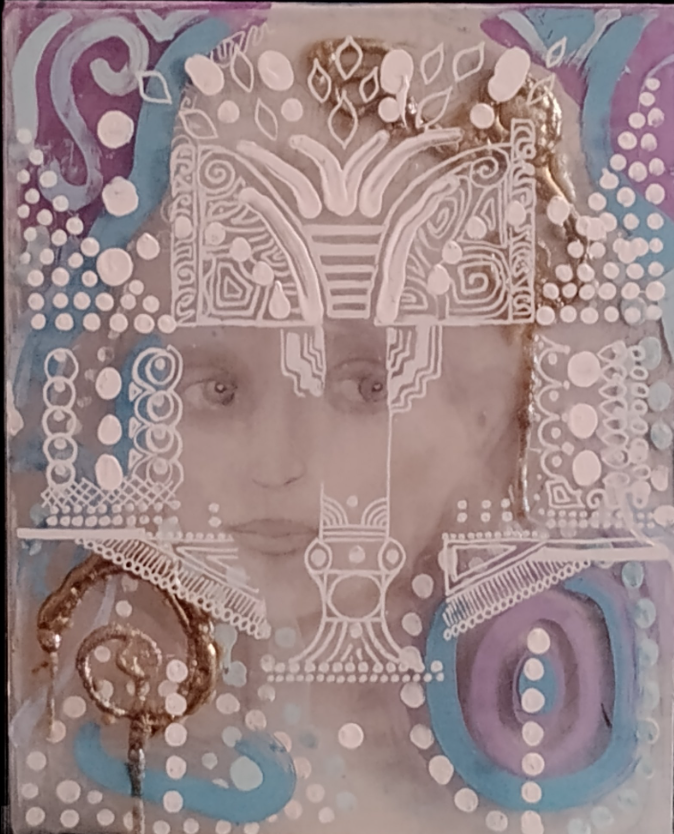 Pamela Goldman's portraits allow us to search within ourselves for lost words and the inner calligraphy of a Phoenician alphabet. A simple, joyous essence woven like silk, celebrating like a sage who has found the udumbara flower. Portraits are like leaves stretching out-beautiful eyes across an ocean. A single whisper, it does not need words. It is a simple, playful expression, but of care and good nature. In the glowing glass of Pamela's sculptures the eyes of the ocean catch a glimpse of art unfolding. In Pamela Goldman's art, eyes are a window, a window to the world. Almost as if we would be sailing across sea, our eyes can stretch far out into the distance and gather buds of wisdom. We see the ocean, freshness of the breeze and the open expanse. We see the wide open space with our own eyes or we may look deep into her eyes. We want to be other than here. Pamela Goldman's painting 'I am Not Here / Other Than Here' allows us to reimagine ourselves, to see ourselves in a new light and recreate ourselves, almost as if we would be adding branches to a tree to capture more light. Yet, there is also fresh discernment and understanding of our own journey. In Pamela Goldman's art, 'I am Not Here' allows us connect the wisdom in the eyes of 'I am Not Here' to the greater reality, and the journey is a bridge to get there, perhaps symbolic of inner growth and fortitude. Pamela Goldman captures beautifully the emotional essence of the Mona Lisa. Being here, yet, not being here. Or being between two states, perhaps even two states of mind. Maybe at times, being not here is a way to find ourselves. Also when we look deep into her portraits eyes, we find ourselves not being present in the here, which itself opens us up to creative flow and seeing and discovering what lay / is hidden (not here). We take something that was not perceived, from the unconscious into the perception, into the conscious and into awareness. Sculptures like 'Indochine' tell a joyous story in Pamela Goldman's art. A beautiful blue turquoise may reflect the vastness of the ocean’s surface. The blue turquoise stretches our imagination as far as our eyes can see. The depth of the ocean within the sculpture itself. Like waves, flowing, gentle and elegant. Other portraits play on royal mystery, grace and contemplation. The blue of the ocean flows gently. We meditate, a wave approaches. Above the deep blue sky white clouds glide peacefully (across) the canopy. The (inner) ocean (that) engages the shore, interconnects and spreads inner contemplation. There is a fresh day and we meditate by the sea, as we take in the magic of the painting like the horizon where sky and sea ajoin, enjoying (the) reflection(s) of (another) daybreak. Pamela Goldman's art juxtaposes geographic imagery with a soft, lively atmosphere. Soft blue, sky blue, speaks to the soul and curiosity: What is being discussed in the Winter Palace and can we be part of the conversation? A beautiful poise, and soft colors with sky blue create a sense of harmony between her (the women in the portraits) and her interlocutor(s), they communicate flow.