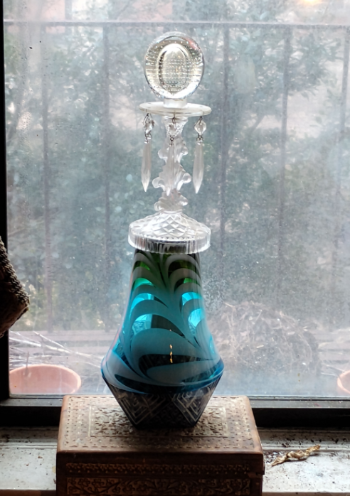 It is in the ascertainment of a simple lucid fact, a precise knowing that form is the truest function, that both sides of a scholarly debate can equate to the good and to the elegant. The soft purple and emerald turquoise flow from within her mightily. Both colors juxtapose any possible outer, external discernment to ground theory in a silver line of rapid, instant clarity. An elegant strategy.