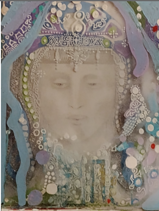 Pamela Goldman's portraits allow us to search within ourselves for lost words and the inner calligraphy of a Phoenician alphabet. A simple, joyous essence woven like silk, celebrating like a sage who has found the udumbara flower. Portraits are like leaves stretching out-beautiful eyes across an ocean. A single whisper, it does not need words. It is a simple, playful expression, but of care and good nature. In the glowing glass of Pamela's sculptures the eyes of the ocean catch a glimpse of art unfolding. In Pamela Goldman's art, eyes are a window, a window to the world. Almost as if we would be sailing across sea, our eyes can stretch far out into the distance and gather buds of wisdom. We see the ocean, freshness of the breeze and the open expanse. We see the wide open space with our own eyes or we may look deep into her eyes. We want to be other than here. Pamela Goldman's painting 'I am Not Here / Other Than Here' allows us to reimagine ourselves, to see ourselves in a new light and recreate ourselves, almost as if we would be adding branches to a tree to capture more light. Yet, there is also fresh discernment and understanding of our own journey. In Pamela Goldman's art, 'I am Not Here' allows us connect the wisdom in the eyes of 'I am Not Here' to the greater reality, and the journey is a bridge to get there, perhaps symbolic of inner growth and fortitude. Pamela Goldman captures beautifully the emotional essence of the Mona Lisa. Being here, yet, not being here. Or being between two states, perhaps even two states of mind. Maybe at times, being not here is a way to find ourselves. Also when we look deep into her portraits eyes, we find ourselves not being present in the here, which itself opens us up to creative flow and seeing and discovering what lay / is hidden (not here). We take something that was not perceived, from the unconscious into the perception, into the conscious and into awareness. Sculptures like 'Indochine' tell a joyous story in Pamela Goldman's art. A beautiful blue turquoise may reflect the vastness of the ocean’s surface. The blue turquoise stretches our imagination as far as our eyes can see. The depth of the ocean within the sculpture itself. Like waves, flowing, gentle and elegant. Other portraits play on royal mystery, grace and contemplation. The blue of the ocean flows gently. We meditate, a wave approaches. Above the deep blue sky white clouds glide peacefully (across) the canopy. The (inner) ocean (that) engages the shore, interconnects and spreads inner contemplation. There is a fresh day and we meditate by the sea, as we take in the magic of the painting like the horizon where sky and sea ajoin, enjoying (the) reflection(s) of (another) daybreak. Pamela Goldman's art juxtaposes geographic imagery with a soft, lively atmosphere. Soft blue, sky blue, speaks to the soul and curiosity: What is being discussed in the Winter Palace and can we be part of the conversation? A beautiful poise, and soft colors with sky blue create a sense of harmony between her (the women in the portraits) and her interlocutor(s), they communicate flow.